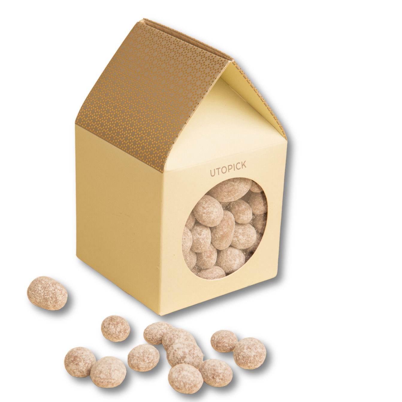 Grano de café tostado, chocolate con leche (leche entera en polvo, habas de cacao,azúcar, manteca de cacao, emulgente, lecitina de soja, vainilla) azúcar lustre.