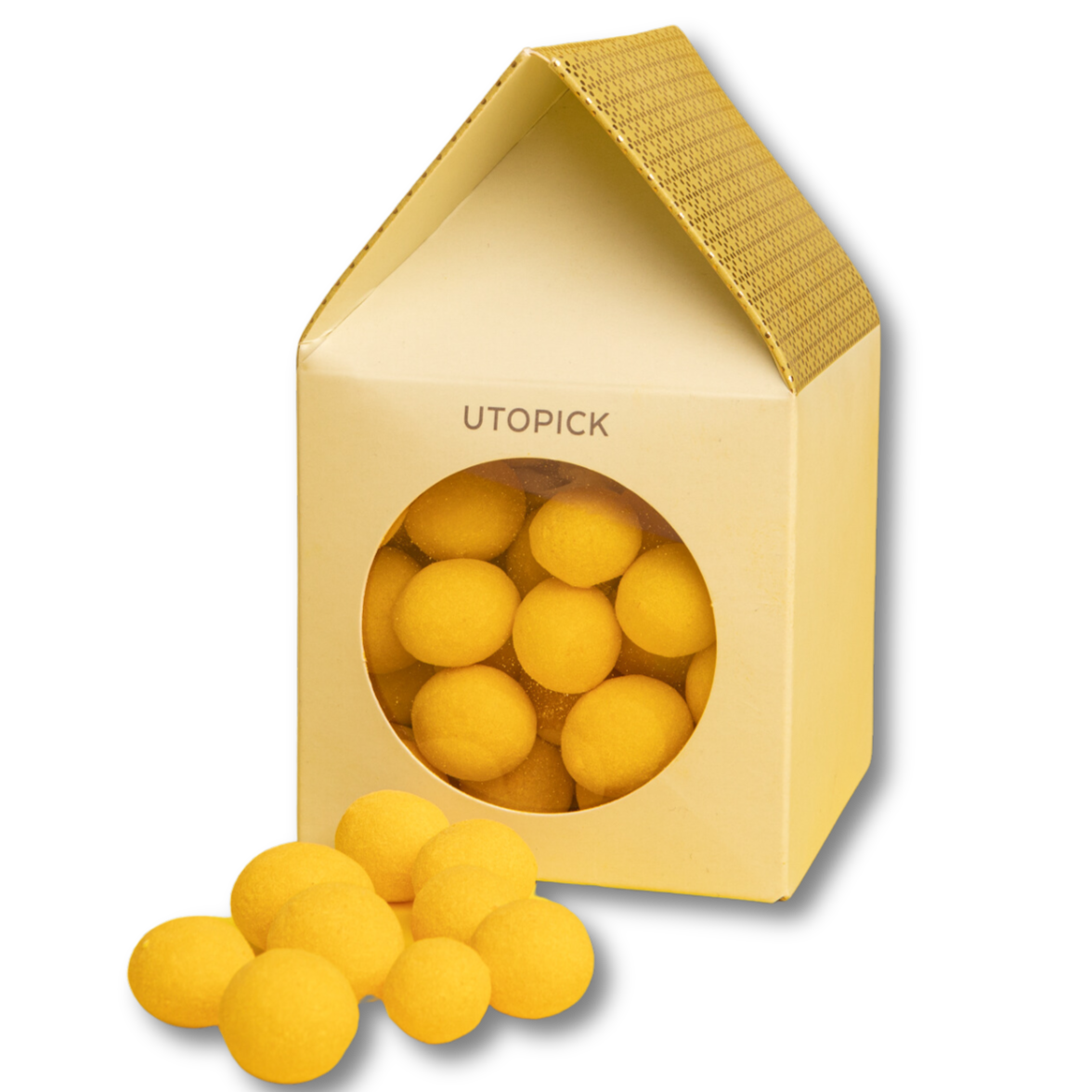 Cobertura blanca (azúcar, manteca de cacao, leche entera en polvo, emulgente: lecitina de soja, extracto natural de vainilla ),dados de limon confitados, polvo de limon y Yuzu.