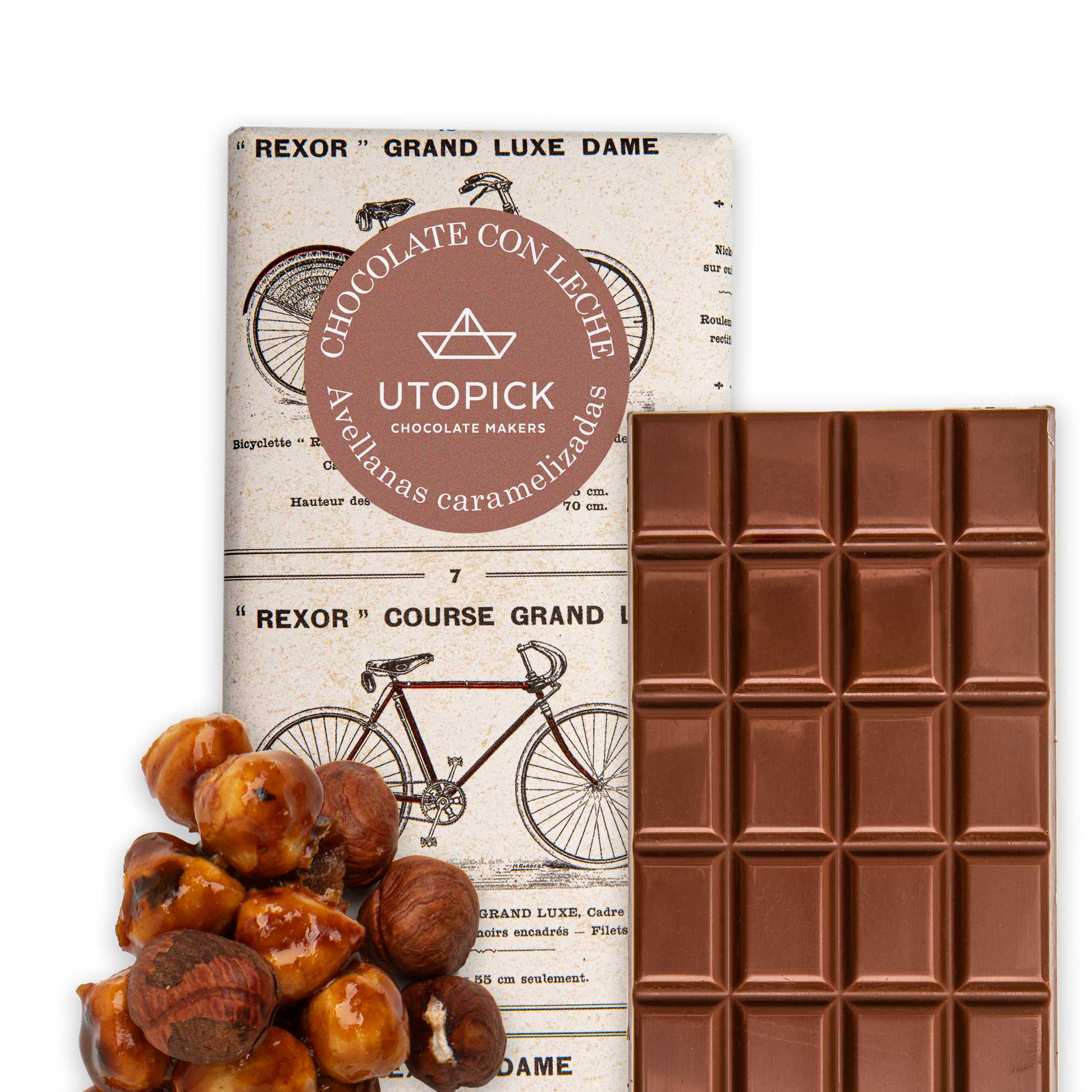 Tableta de chocolate con leche 38% cacao y avellanas caramelizadas.