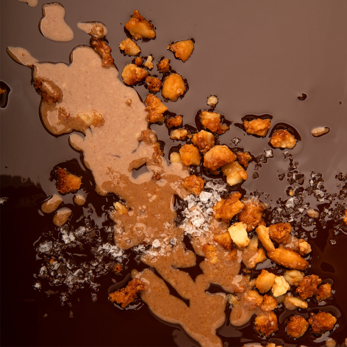 Chocolate (70% de cacao) con puntos de praliné de macadamia y pequeños trozos de nueces de macadamia al punto de sal. No nos importa (para nada) que esta tableta juegue a dos bandas. Que combine lo dulce y salado y nos haga perder la cabeza. Brutal de principio a fin.