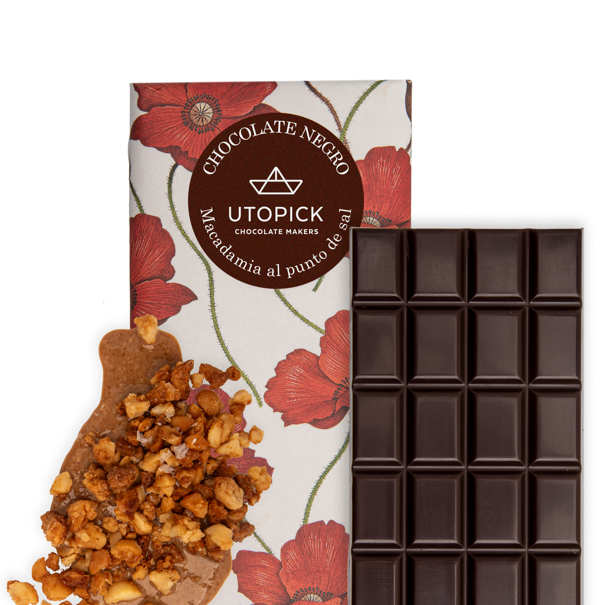 Tableta de chocolate 70% cacao con macadamia caramelizada al punto de sal.