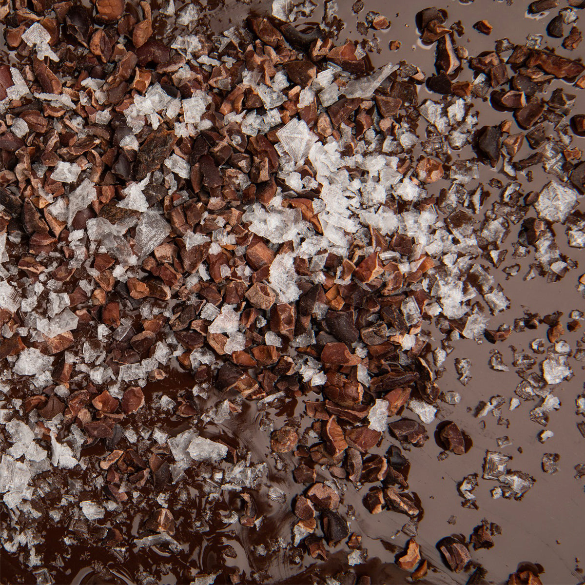 Chocolate negro (70% de cacao) acompañado por sal mediterránea en escamas y nibs (pedacitos de cacao tostado) que lo complementan a la perfección. Menudo combo invencible. Para aquellos que quieren contrastes sin perder sabor y presencia.