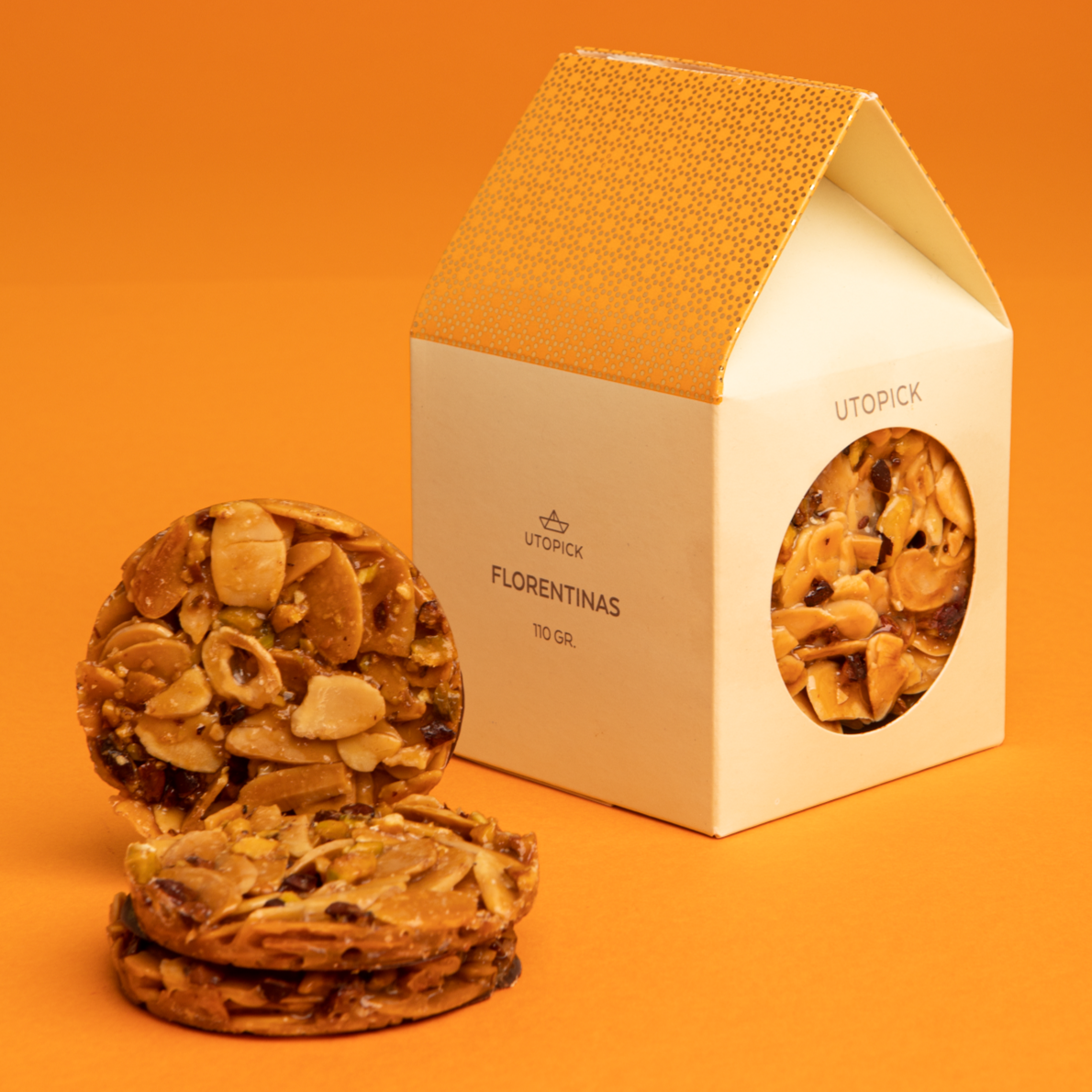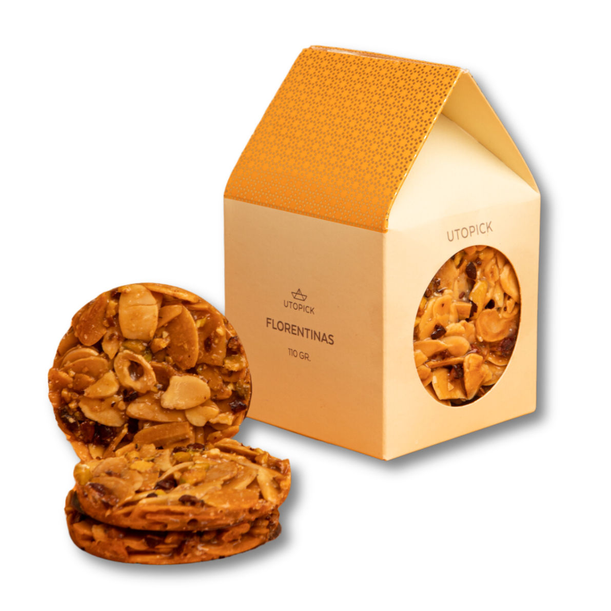 Almendras, pistachos,Cobertura de chocolate 70% cacao (Pasta de cacao, azúcar, manteca de cacao pura, lecitina de soja, aroma natural de vainilla),glucosa, azúcar integral de caña y mantequilla, y nibs de cacao.
