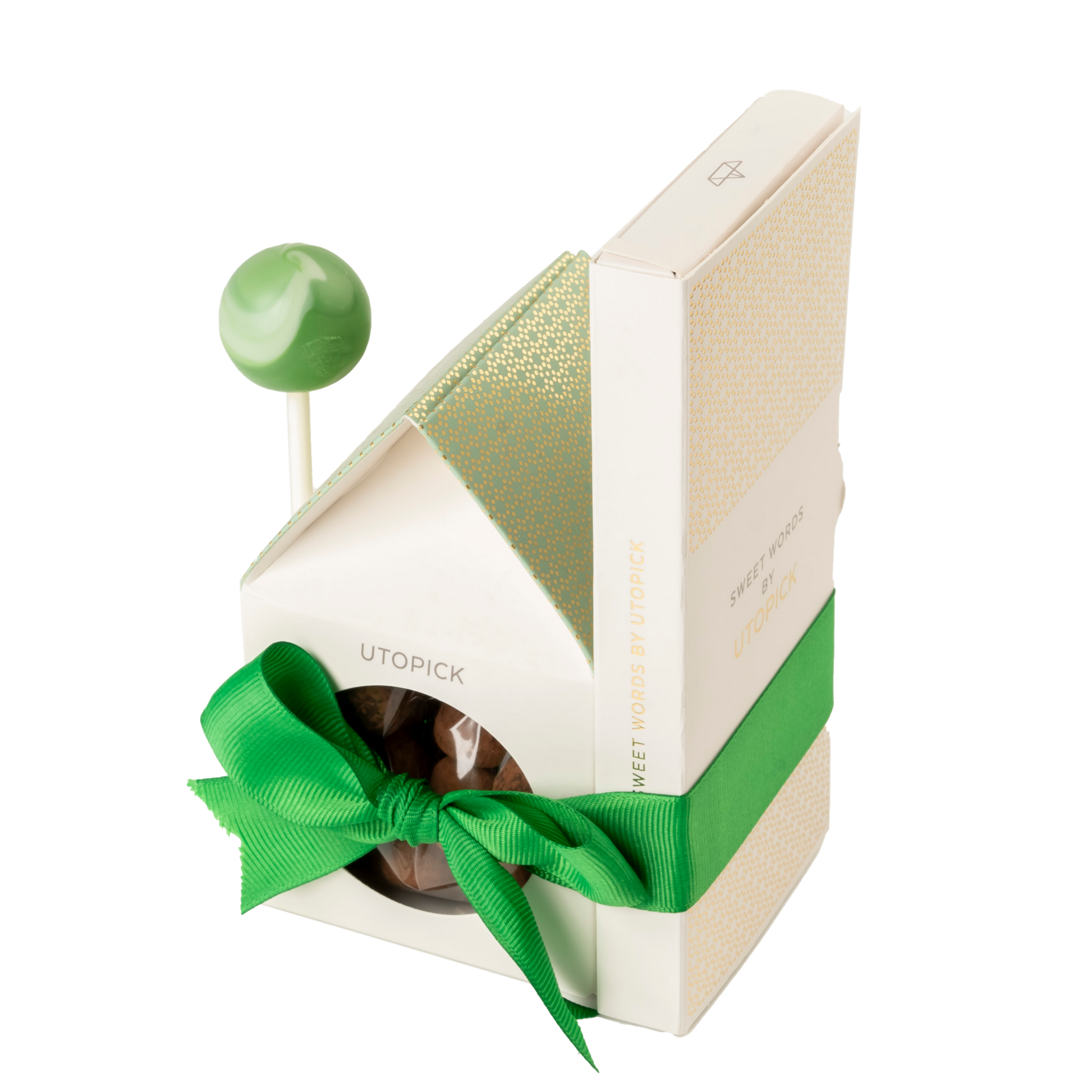 El color de la esperanza, que tanta falta nos hace. Elige la frase que deseas. Además, te llevas una cajita de almendras chocolateadas y un chupa-chups de praliné crujiente. ¡Súper!