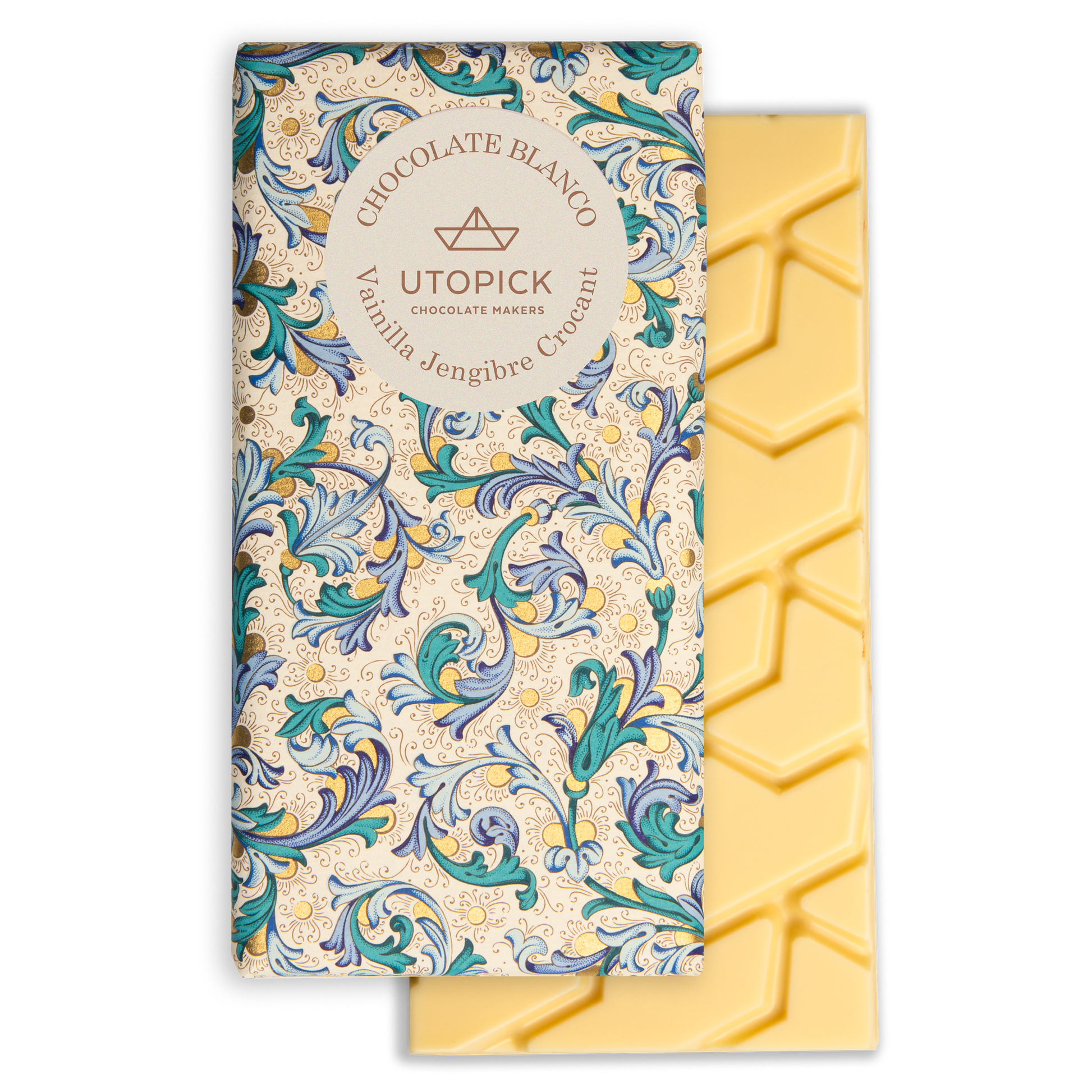Tableta de chocolate blanco (cacao min. 34%) con vainilla, jengibre confitado y crocant de almendra.