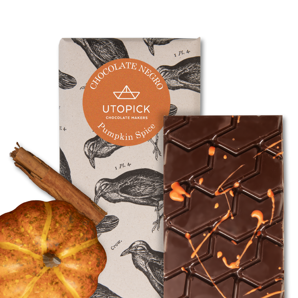 Tableta de chocolate negro (cacao min. 70%) relleno con crema de calabaza y especias.